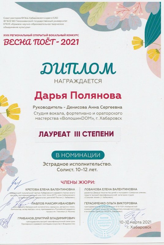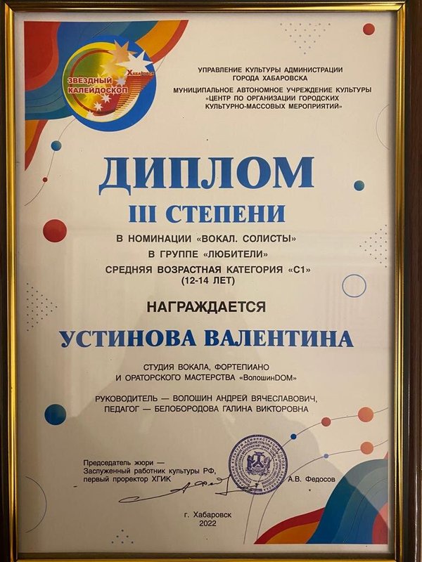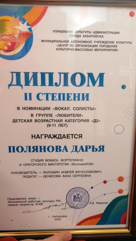 Преподаватель по вокалу Диана Руслановна - человек, который действительно не безразлично относится к своей работе. Видно, что она подбирает индивидуальный подход, думает, как лучше заниматься. И самое главное - ребёнку нравится, она с радостью ходит на занятия. У нее уже есть положительные результаты, я вижу её рост.