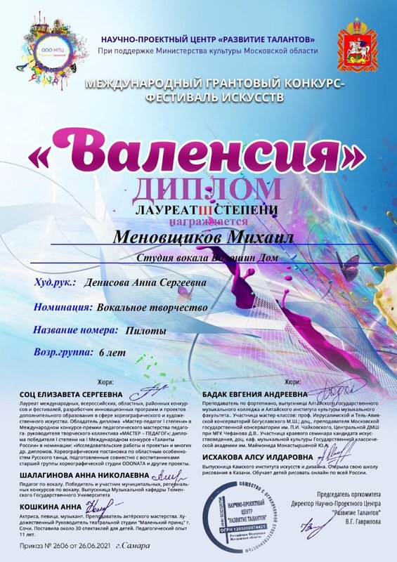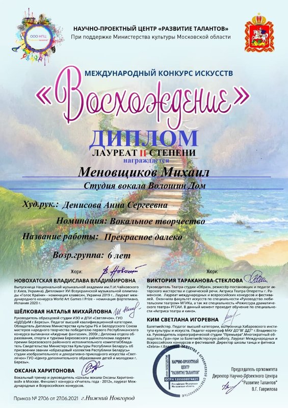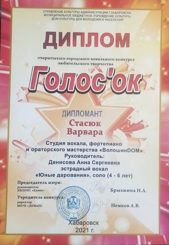Мой старший ребенок посещает студию вокала и фортепиано, нам очень нравится педагог Анастасия Сергеевна Илющенко. В работе с ребенком педагог проявляет высокий профессионализм: у ребенка есть интерес к занятиям, он занимается охотно и даже участвует в конкурсах, что показывает его прогресс. Мы очень довольны и с радостью рекомендуем данного педагога.