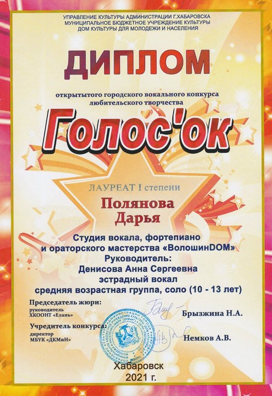 Мне нравится результат, который у меня есть, а также развивающимся слухом и правильным путем. Я также очень доволен моим педагогом Женей Лапушкиной, которой благодарен.